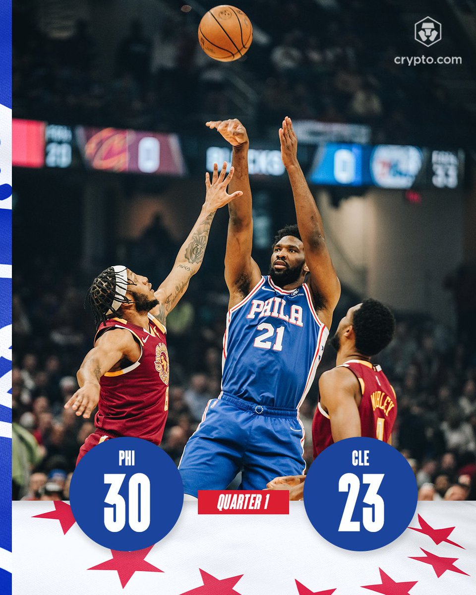Sixers 30, Cavs 23 at the end of the first. Sixers led by as many as 16, but Cleveland trimmed that in the latter part of the quarter. Embiid is off to a scorching start (13 points on 6-of-6 shooting, 8 rebounds) after being listed as questionable to play with back soreness. – 7:36 PM