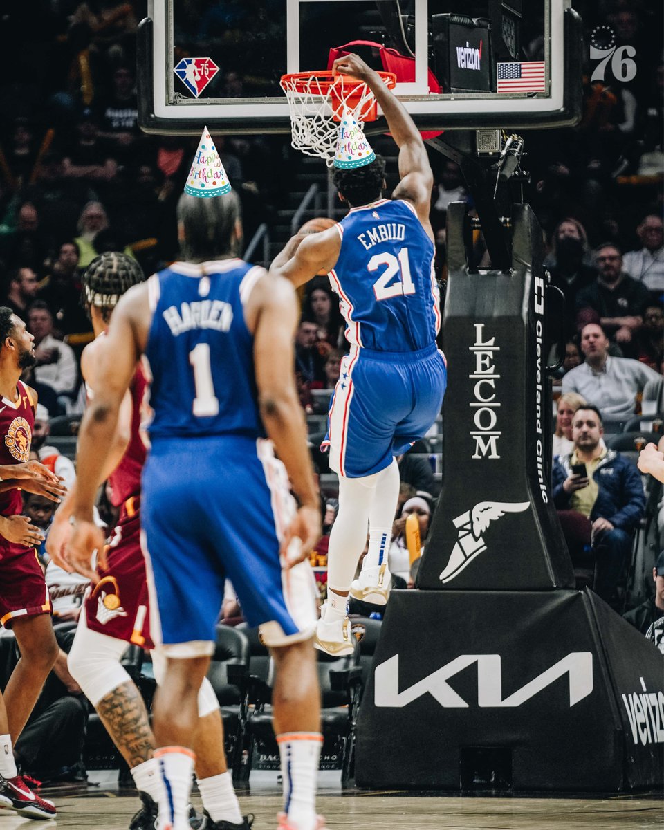 Forget the cake. Embiid is out here eating up the #Cavs for his birthday. Twelve early points on 5-5 shooting to go with six rebounds and two assists. #Sixers lead 24-10with 3:45 left in first quarter. pic.twitter.com/j0XDPQslqx – 7:26 PM