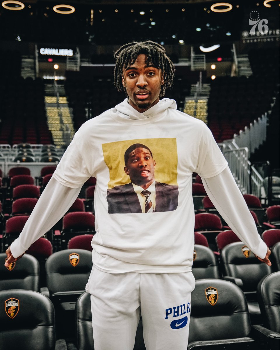 Tyrese Maxey on receiving Joel Embiid’s birthday surprise t-shirt – a surprise courtesy of Georges Niang – on his loop this morning: