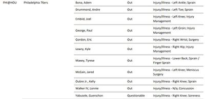 We have the Sixers’ initial injury report for Monday night visiting the Houston Rockets and it’s lengthy, as expected.