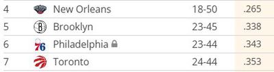 Both Philadelphia as well as the Brooklyn Nets, currently fifth-worst in the NBA, won their games on Sunday, so it’s a wash there. Meanwhile, though, the Toronto Raptors lost on Sunday, pulling them within just half a game of the Sixers in sixth. The Raptors also play again tonight, visiting the Phoenix Suns at 10 p.m. ET.