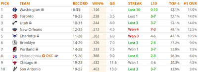 Portland has just one fewer win than Philadelphia. They’re a young team with no generational (as of yet) star and veterans to trade, so I’d expect them to tank. But they can be a pretty tough beat on their night. It seems they will compete until around the Feb. 6 trade deadline. So, Philly should tank now if they want to get a leg up (down?) on Portland.