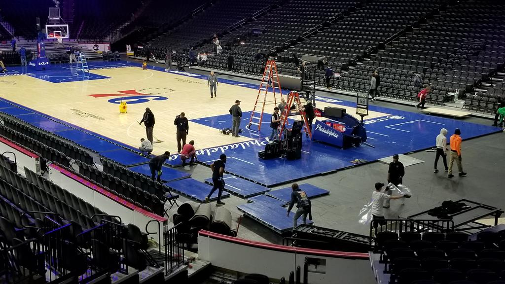 Back to the NBA tonight, but won’t be seeing any players just yet. They’re still changing the ice to basketball here in Philly.