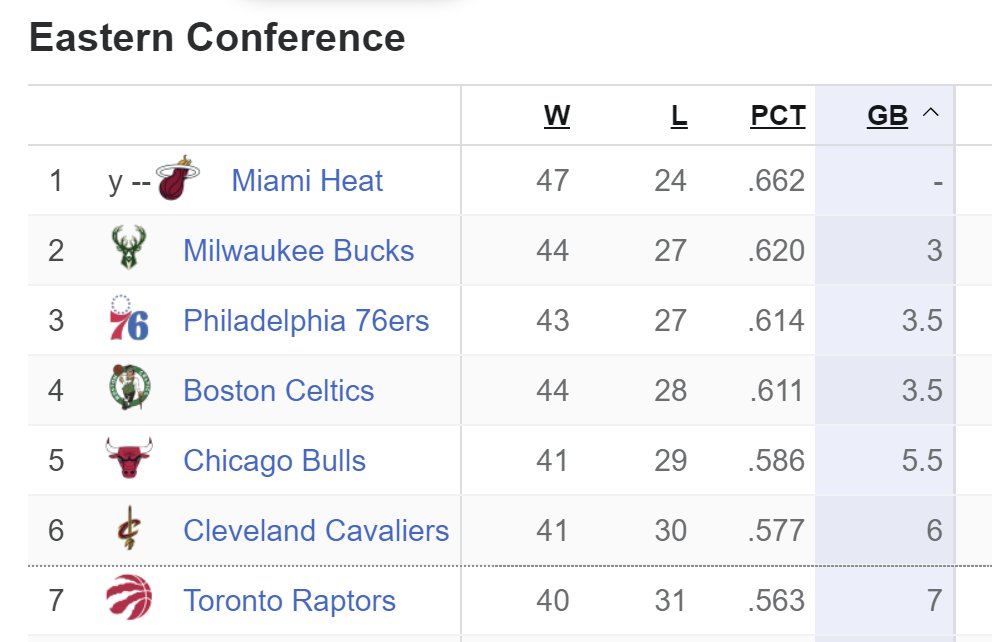 Sixers lose to Toronto, so Milwaukee moves into 2nd in the East, 3 behind Miami. Boston and Philadelphia are now tied for third, 3.5 games back. Miami vs. Philly tomorrow but Milwaukee is off, so Miami win + Boston win would tie Boston with Milwaukee for 2nd – 11:05 PM