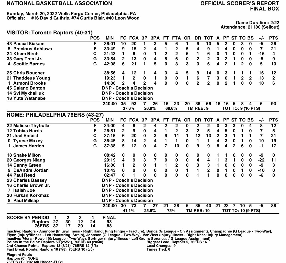 Toronto Raptors 93, Philadelphia 76ers 88 (Final)