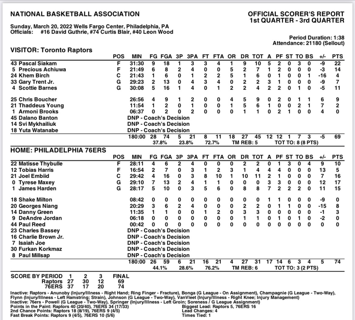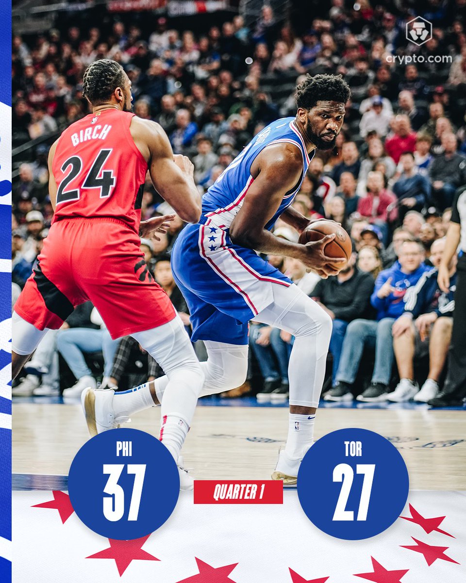 The Sixers scored 37 points in the first quarter and managed just 51 the rest of the game. They lose to Toronto, 93-88. They are 43-27 on the season.