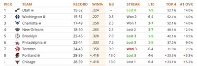 We’re all thinking lottery odds at this point, so let’s check in with Tankathon to see how the lottery picture looks. The Raptors picking up a three-game win streak helps the Sixers’ place in sixth, although reaching the top four is looking increasingly hard: