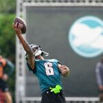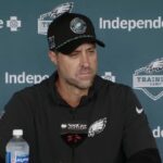 Philadelphia’s first-year offensive coordinator met with the media on Saturday morning. The Eagles were back to work on Saturday for their third practice of training camp, and offensive coordinator Kevin Patullo spoke to reporters before taking the field. He talked about his new role, how much freedom Jalen Hurts has within the offense, and how things might look differently … [Read more...] about Kevin Patullo talks Jalen Hurts’ freedom to make decisions within the Eagles offense
