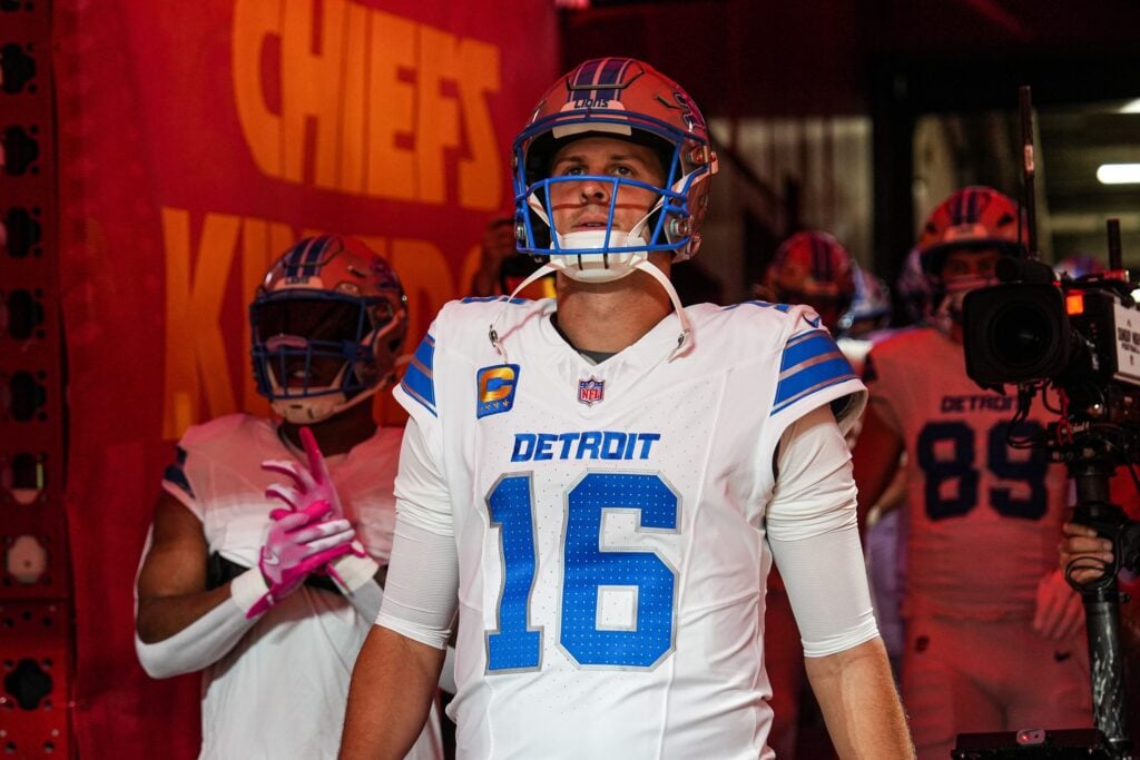 Detroit Lions quarterback Jared Goff (16) leads a group of players out of the tunnel for warm-up at Arrowhead Stadium in Kansas City, Missouri on Sunday, Oct. 12, 2025.