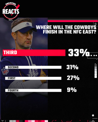 When asked in early-July about where Dallas will land among the NFC East, only 29 percent of fans picked their team to win the division. Sixty-four percent of fans figured the Cowboys would finish No. 2 or 3, and a surprisingly high nine percent thought they would actually end up being worse than the Giants and finish in last place.