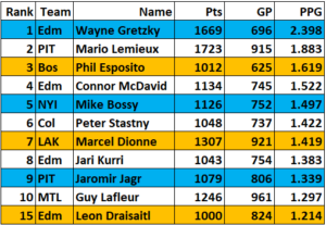 However, only Wayne Gretzky and Jari Kurri, among those teammates who played a long time together, have both totaled over 1000 points in fewer combined games than Draisaitl and McDavid. That’s not in terms of best point-per-game, just that they each recorded 1000 points. Now, if we consider the best point-per-games of those who scored 1000 points with one franchise, let’s check out those stats.