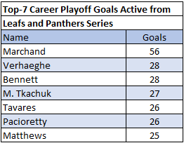 Before we do that, here is a look at the top players on the all-time playoff goal list from the Leafs vs Panthers series. This sets the tone for the players involved and how they matchup with the entire league in some regards. Marchand is the only one in the top 50. Meanwhile, the other guys are close to one another, each ranking somewhere within the 200s on the all-time playoff goal list.